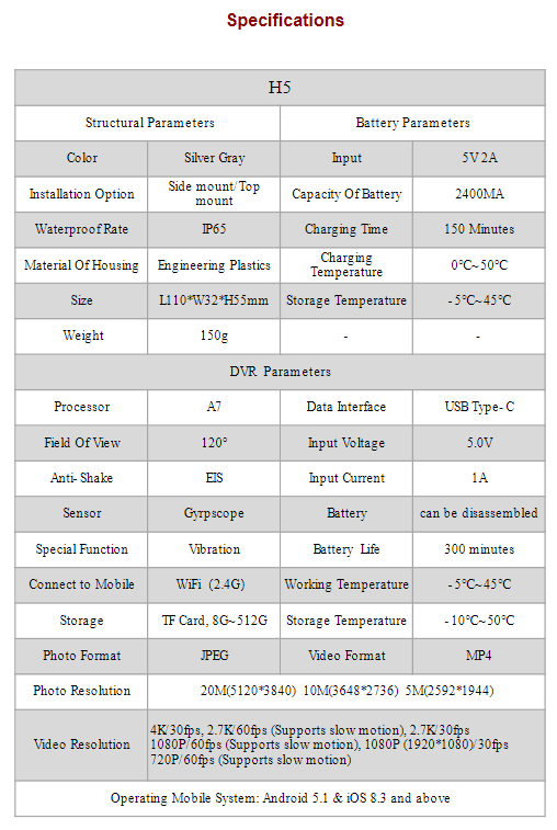 Extra long battery life of up to 5 hours of recording time. The H5 offers non-stop recording at the highest quality. It comes with a portable power interface giving you a secondary option if needed. Plug the camera into a power bank between race heats for easy recharging.. never miss a heat again.